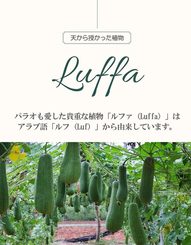 アラブ語である「ルファ」は「たわし」として知られていますよね。キュウリ科に属する熱帯・亜熱帯性ツル作物であるルファの中にはセルロース繊維網組織があります。この組織に角質除去の効果があり、エジプト人たちはこの天然たわしをシャワータオルとして使用したとされています。ルファシャワータオルは程よい刺激でなめらかに角質を除去します。全世界にある高級ホテルのアメニティとしても提供されるプレミアムシャワー用品です。