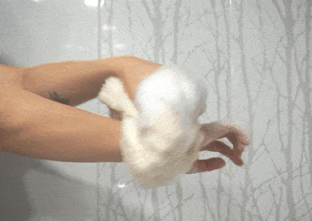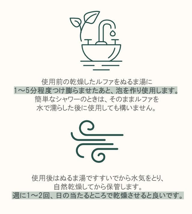 使用前は水に濡らしシャワージェルを付けて十分な泡を作ってください。シャワー後はきれいな水ですすぎ水気をとってから乾燥させてください。週に一度程度は日の当たるところで乾燥させるとより良いです。