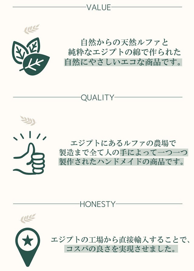 合成素材で作られるシャワータオルは100年過ぎても土に還りにくいため、環境に考慮し、またルファを直接製作する上での試行錯誤を重ねながら、エジプト天然商品関連のブランド、メンディサナチュラルズを立ち上げました。