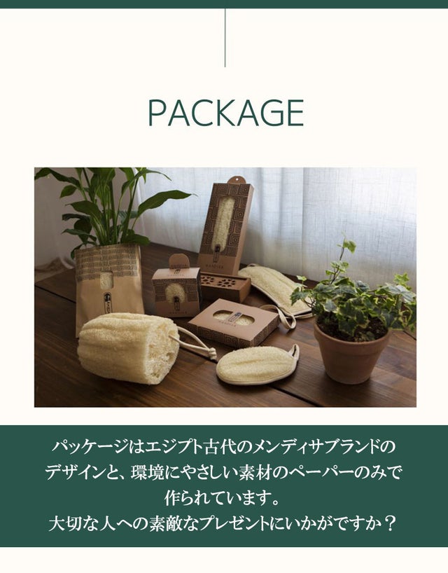 全ての「メンディサ」は自然から得たもので自然にやさしい商品です。人体に無害で敏感肌の方でもご使用いただけます。その役目を果たしたあとも、土で分解され地球に負担のない天然ボディータオルです。高級ホテルのアメニティにも使われる天然シャワータオル「ルファ」を家でもお気軽にご体験ください。