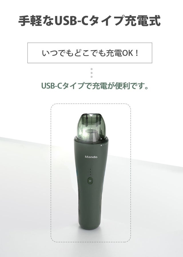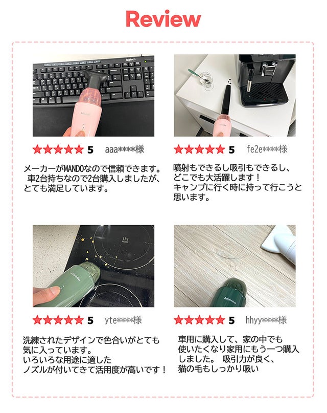 MANDOのエアガン掃除機はおしゃれなデザインがまず目に留まりましたが、強力な噴射パワーと吸引力にさらに驚かされた商品です。 ウォッシャブルステンレスフィルターで半永久的に使用できる点も便利で、USB―Cタイプで簡単に充電できるのも嬉しいですよね。自動車だけでなく、ご家庭でも簡単&手軽にご使用いただけるのでとてもオススメです。