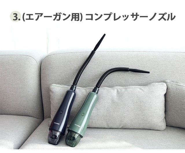 以下のように3種類のノズルを装着してみてください。 手の届かない狭い場所や隅々まできれいにお掃除できます。