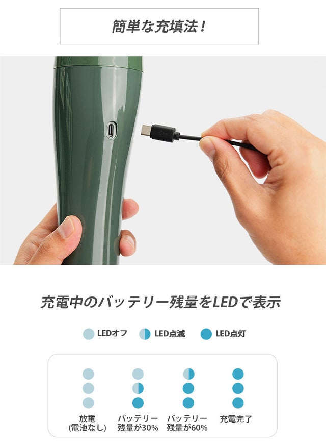 - いつでもどこでもUSB-Cタイプ 充電OK!フル充電時、20分間連続使用が可能!