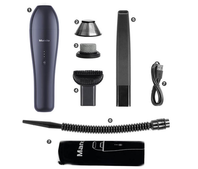 MANDO車用掃除機 本体、ノズル3種(ブラシノズル、ロングノズル、コンプレッサーノズル)、充電ケーブル, ポーチ