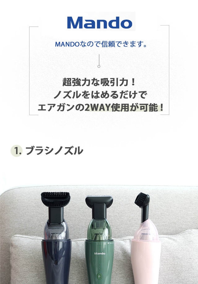 MANDOは基本と原則を遵守し、透明な経営を真っ当するハンラグループに属する中枢企業として、1962年の設立以来、自動車産業の発展を牽引した代表的な自動車部品専門会社です。 現在、世界中で自動車用制動装置、ステアリング装置および緩衝装置を供給しており、ABS、ESP、ECS、EPSなど自動車用先端部品を開発・適用させるなど、新技術開発の先導を切っています。 今回発売したMANDO車用掃除機は、MANDOならではの技術力で独自開発した製品です。 多くの方々にお使いいただき満足していただけるよう、高いクオリティーを維持しながら生産いたします。 応援のほど宜しくお願い致します。