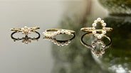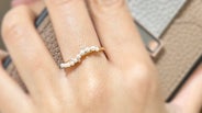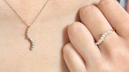 リングに4石、ペンダントには3石の天然ダイヤモンドを散りばめて、より華やかで、女性らしい雰囲気に。リングの腕もややV字にカーブさせて指が綺麗に見えるようデザインしました。