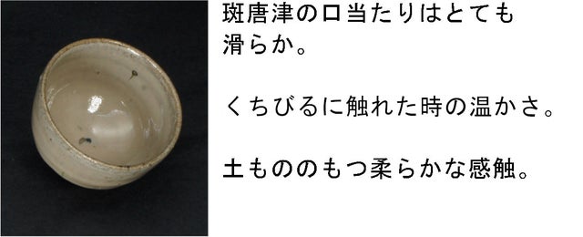 浜本洋好の斑唐津は、ガラス成分を含む窯周辺の陶土を使い1400度近い高温で焼成されるため表面がとても滑らかで口当たりの良いのが特徴。