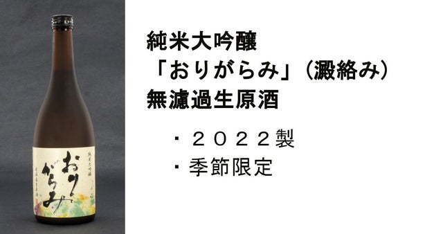 純米大吟醸 おりがらみ(2022年製):新酒 無濾過生原酒 「山田錦」「美山錦」を45%まで磨いた純米大吟醸の無濾過生原酒