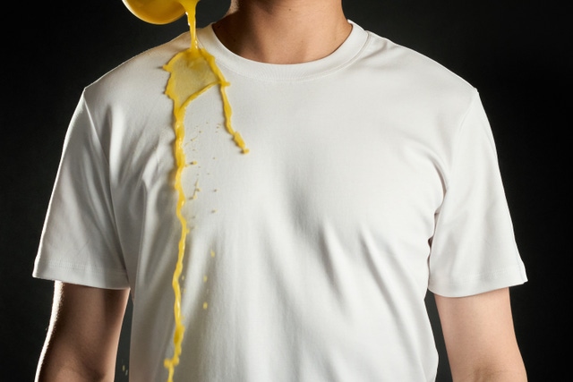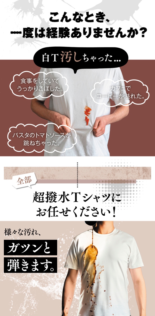 この驚異の超撥水Tシャツは、ただの服とは一線を画します。その秘密は、非常に優れた撥水性。液体の汚れも水でサッと洗えば、まるで初めからついていなかったかのようにキレイに落ちます!すぐに頑固なシミになる醤油だって、このTシャツには敵ではありません!