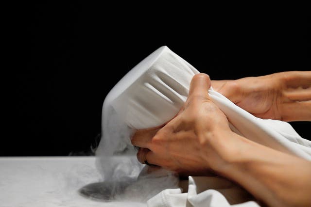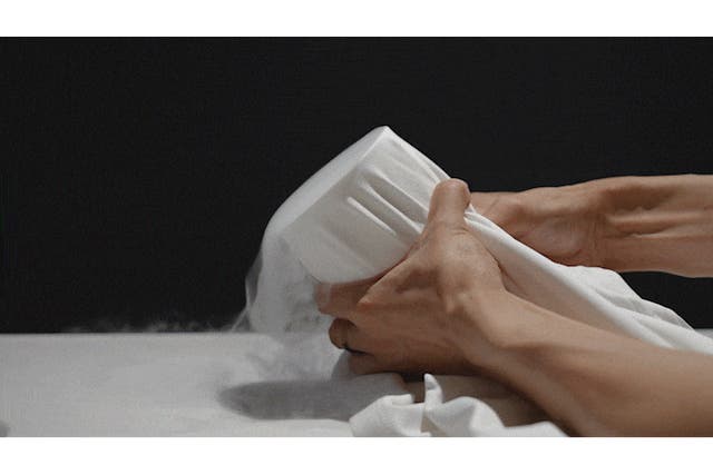 自社従来品のTシャツの糸と比べると、50番手の糸はずっと細かく、それにより一枚の布に多くの糸が密接に織り込まれることになります。この繊細な構造が、水を効率的にはじくバリアを形成します。そのため、水滴は表面からスルッと弾かれてしまうのです。
