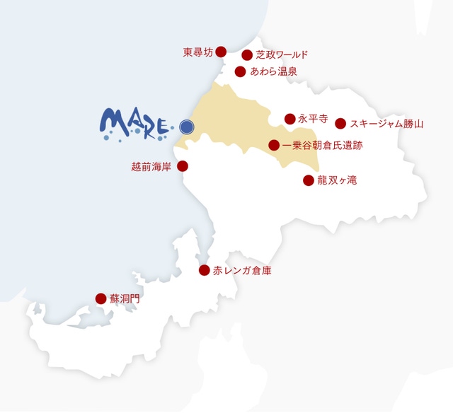 マーレ周辺では、越前海岸の海⽔を汲み上げたお塩をつくっている製塩所や古代⽣物を⾒ることができるミュージアムなど、この場所だから体験できる観光スポットがございます。