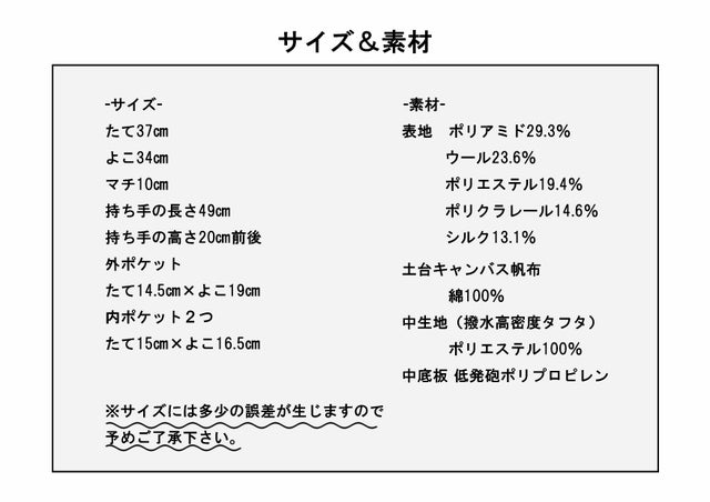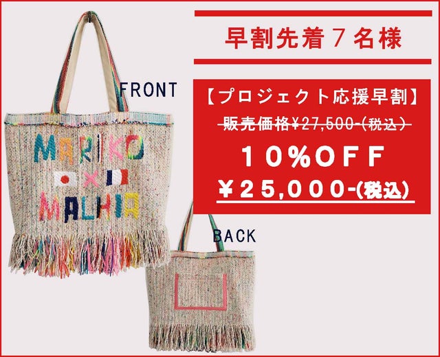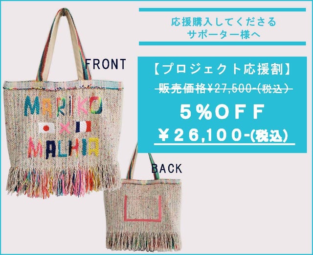 私たちはこのマルチトートバッグを製作する為にプロジェクトを誠心誠意進めております。 ※原則として、配送遅延に伴う応援購入のキャンセルはできませんが、リターン配送予定月から6カ月を超えた場合には、希望者に限りキャンセルにて対応させて頂きます。 ※皆様の応援購入が思いのほか反響があった場合には、第2弾として販売する可能性もございます。 ※こちら表地に使用しているマリアケント社の生地は自然で甘撚りに織られた生地になりますので、フリンジ抜け、糸が飛び出てくる可能性がございます。 その際はフリンジをカットしたり、糸は生地の中に押し入れるなどの対処をして頂けます様、宜しくお願い致します。 マリアケント社ならではの自然な風合い、デザインを楽しんで頂ければ幸いです。 ※ご注文状況、仕様部材の供給状況、製造工程上の都合により出荷時期が遅れる場合があります。 ※応援購入後のサポーター様都合によるキャンセルや返金は受付致しませんのでご了解下さい。 上記の内容をご了承の上で応援購入をして頂けますと幸いです。