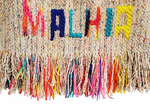 デザインをコンピューターに読み込み、織り機で多色の糸やテープを織り込んでいく作業で作られた手の込んだ生地になります!