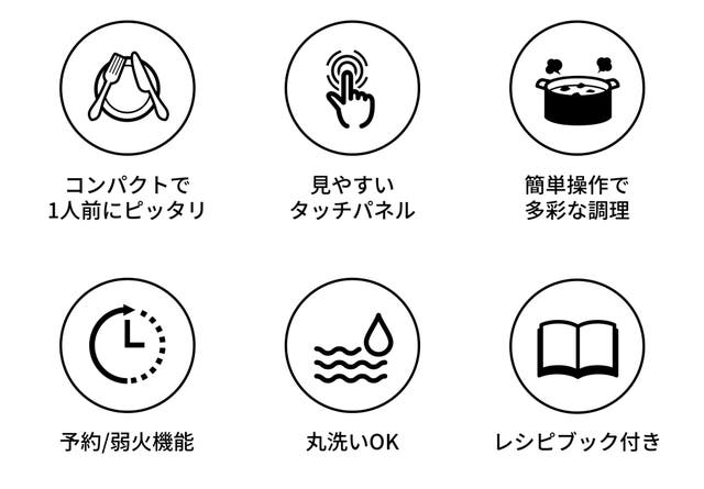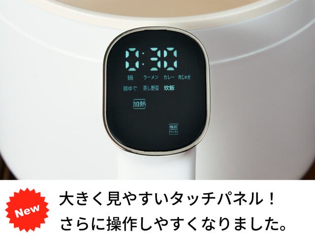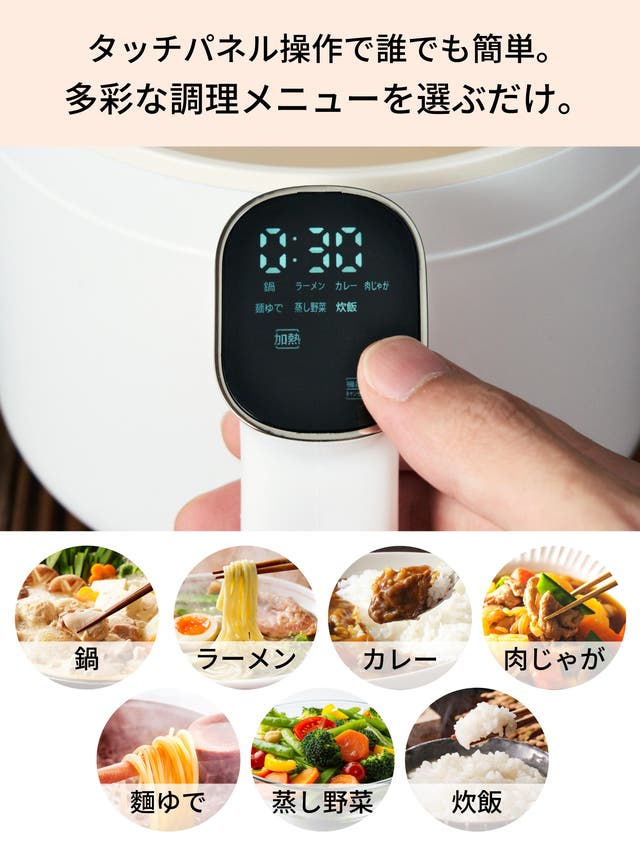 ラーメン、うどんなどの即席料理から、肉じゃがやカレー、スープなどの煮込み料理なども簡単に作れます。大きく見やすいタッチパネルで調理方法(鍋、ラーメン、カレー、肉じゃが、麺ゆで、蒸し野菜、炊飯)を選び、タッチするだけの簡単操作です。予約/弱火機能もついているので、いつでもほかほか出来たて料理を美味しく食べれます。
