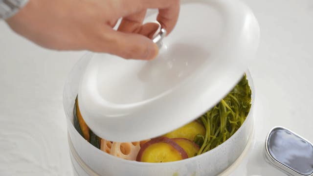 水を入れ、付属の蒸し皿をセットしたら蒸し料理にもご使用いただけます。