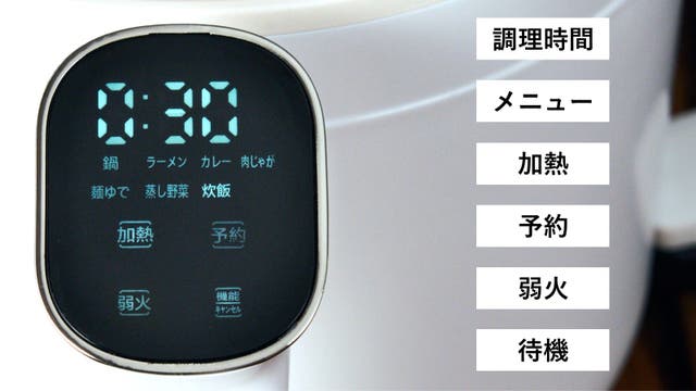 「My Cook NEO」は取っ手にあるタッチパネルから操作できます。鍋、ラーメン、カレー、肉じゃが、麺ゆで、蒸し野菜、炊飯の多彩な調理メニューに加え、予約/弱火機能もタッチパネルから簡単に操作できます。調理時間が液晶パネルで表示され、残り時間をカウントしてくれます。