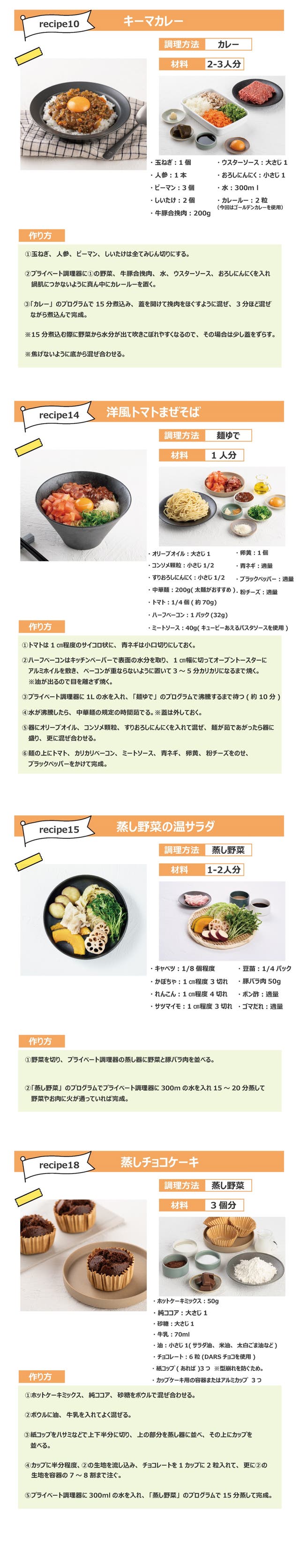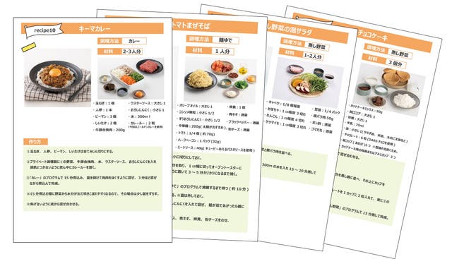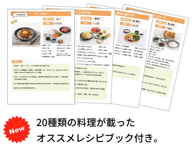 「MyCook NEO」で調理ができる、20種類の豊富なレシピをまとめたレシピブックを付属しています!調理が面倒な方でも、手軽に食事のレパートリーが広がります!