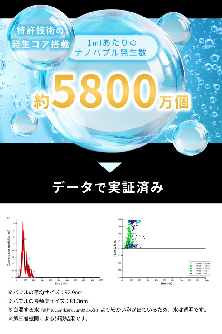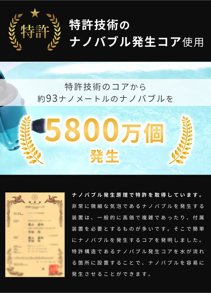 - 浴槽に貼り付けるだけ工事不要!特許技術のコアが約5800万個ものナノバブルを発生