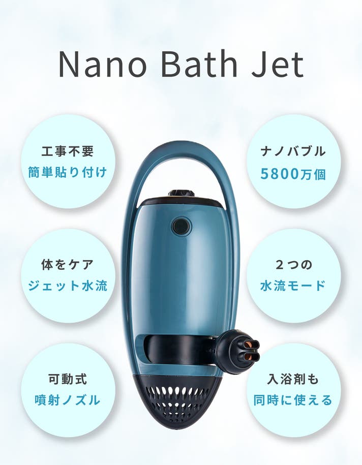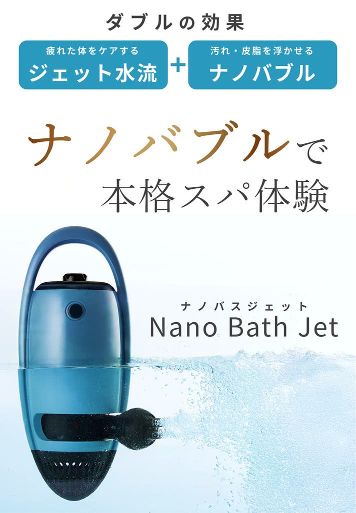 ナノバブルの超微細な気泡が毛穴の奥まで届き、汚れ・皮脂を浮かせ、洗浄します。ナノバスジェットは体のケアだけでなく、ナノバブルにより汚れもスッキリ洗浄できるダブルの効果があります。自宅で手軽にスパ体験が楽しみください。