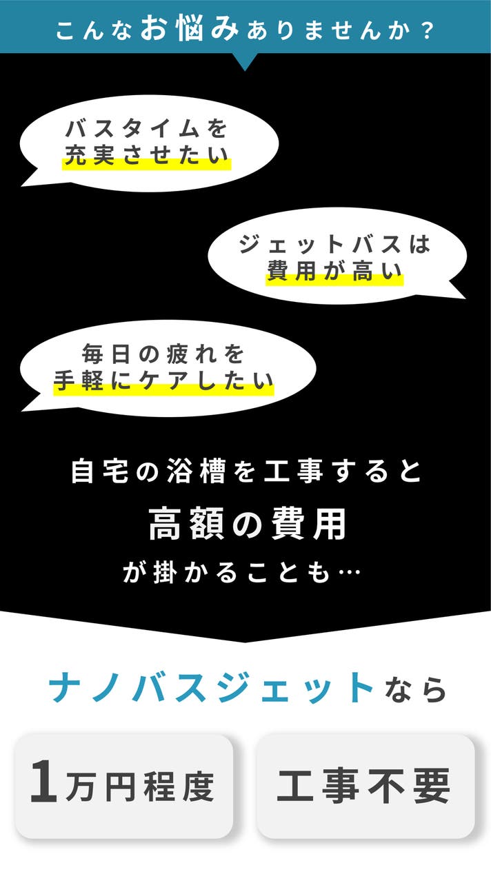 ナノバスジェットは、パワフルかつ安定したジェット水流をお届けします。ジェット水流を肩、腰、ふくらはぎなど体の部位に当てることで、仕事や運動で1日酷使した体をじっくりとケアします。