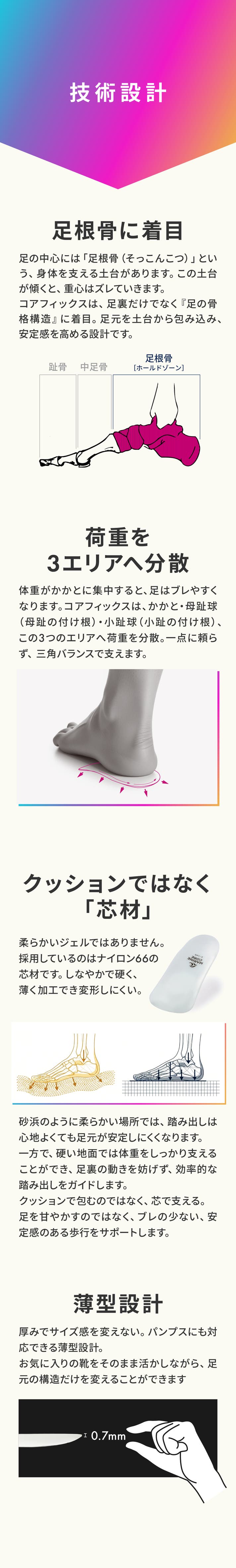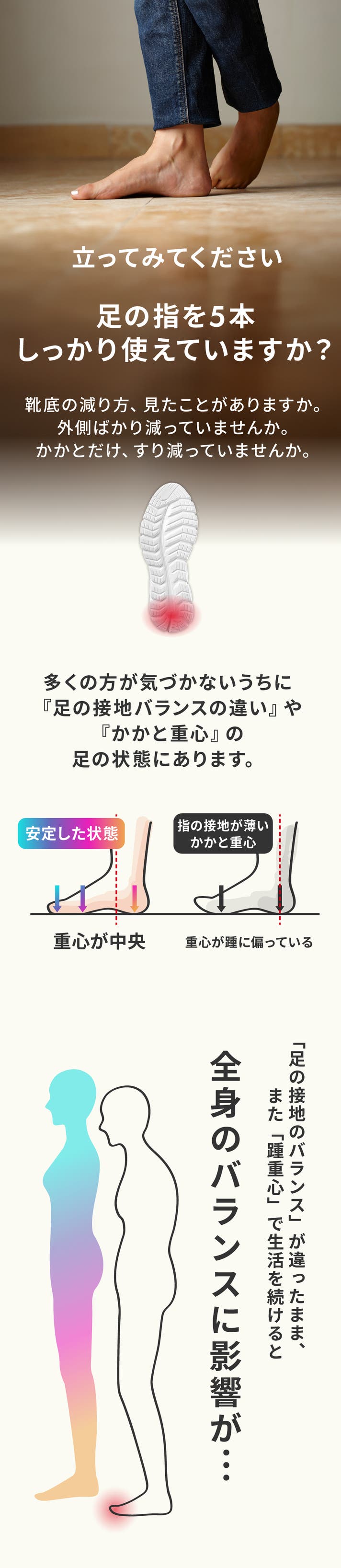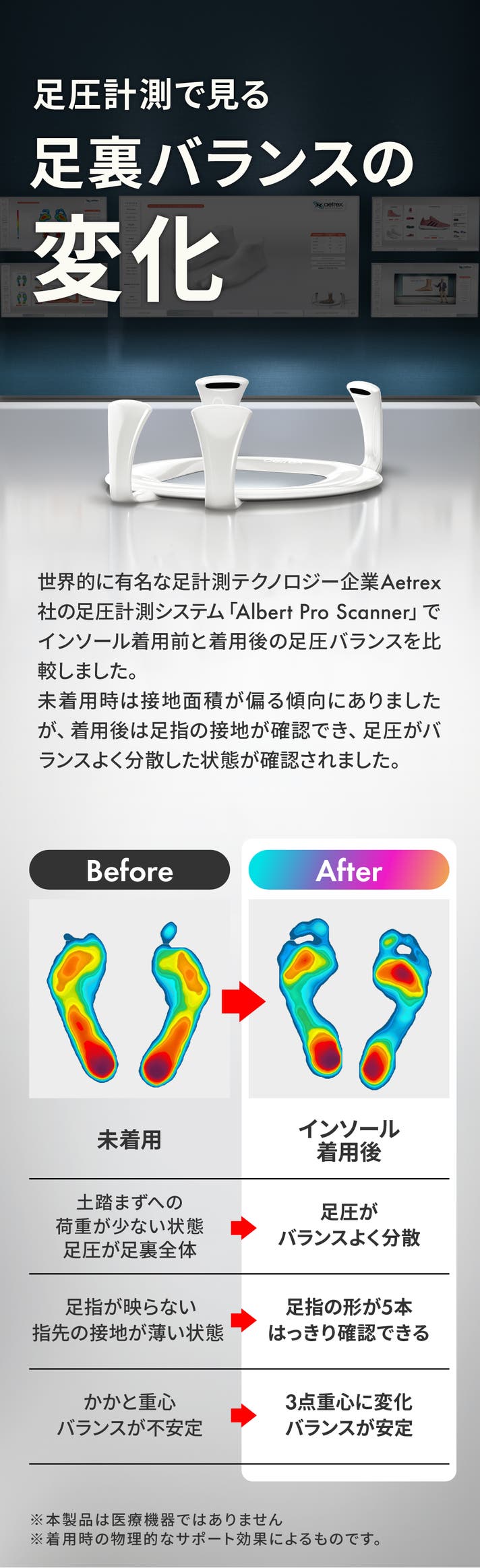 崩れやすい足裏のバランスを、物理的に支えることで理想的な歩行をサポートします。