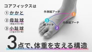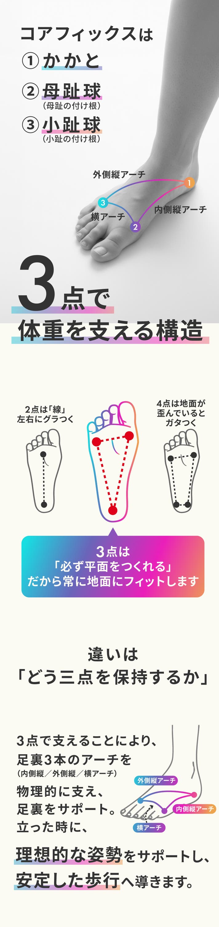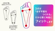 - 【歩行バランスを支える】足裏、3点に重心が乗るようにして、一生自分で歩ける足に
