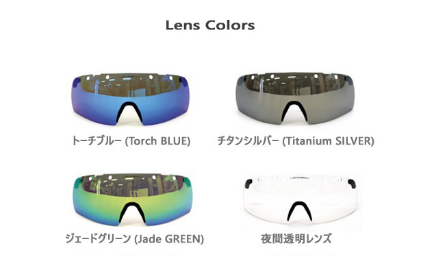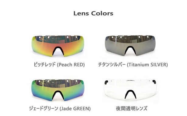 ピッチ・レッド(Peach RED),トーチブルー(Torch BLUE)、チタンシルバー(Titanium SILVER)、ジェード・グリーン(Jade GREEN)、夜間透明レンズ