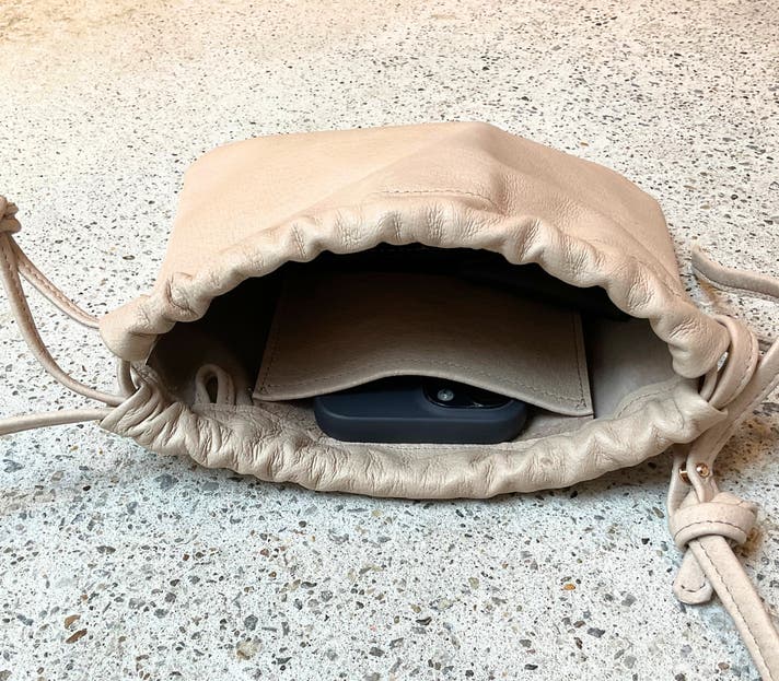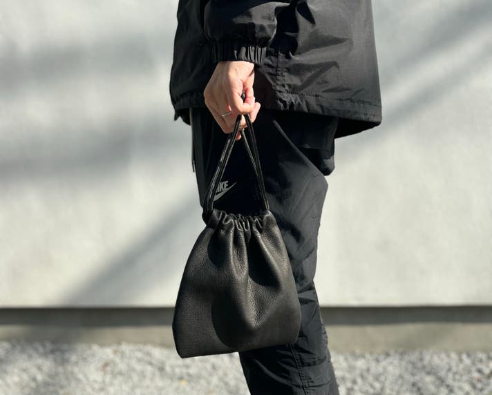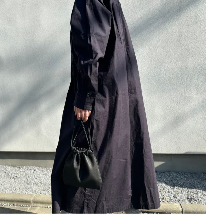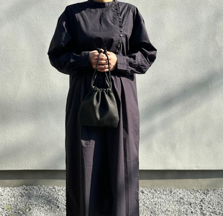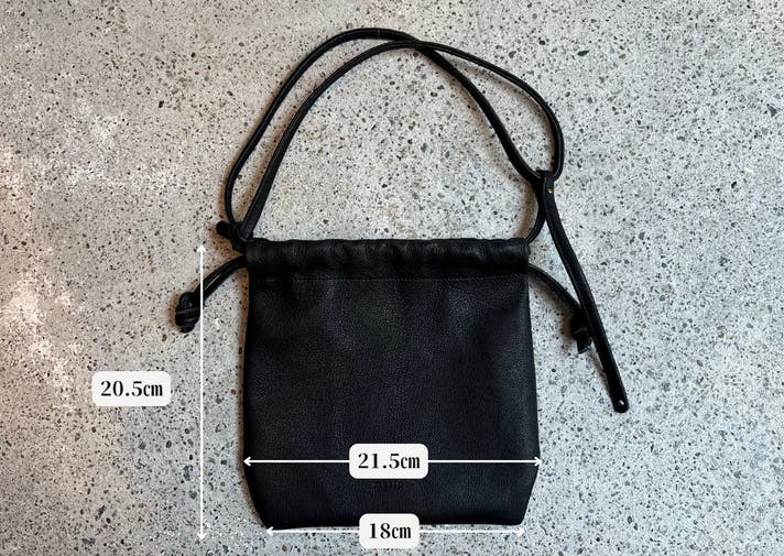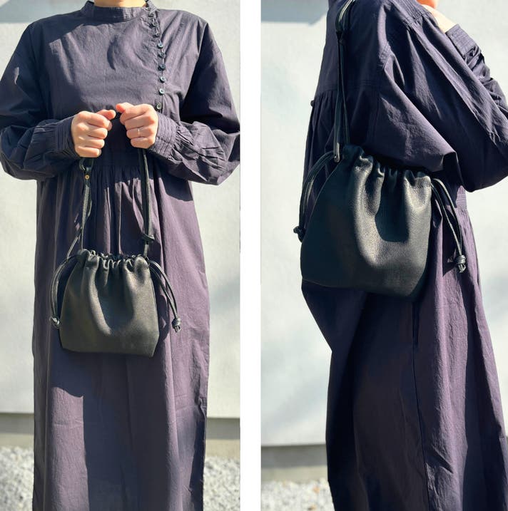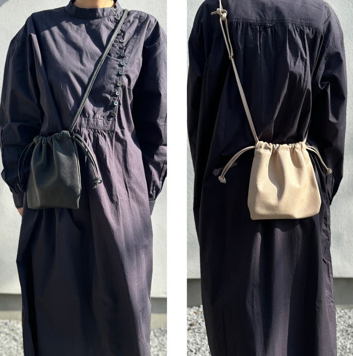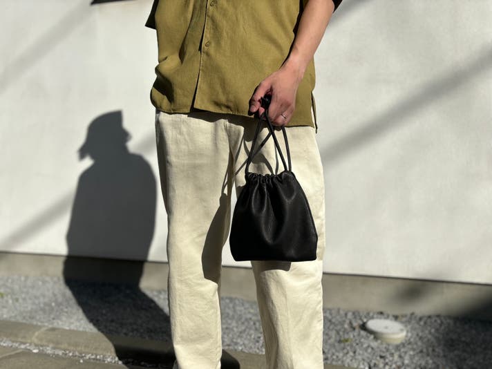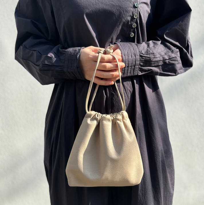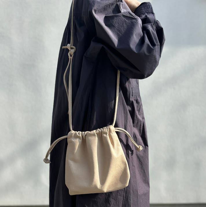 余計な装飾を省き、主張しすぎない美しさを大切に。すっきりとしたシルエットの中に、持つ人を引き立てる上品さを込めました。形の美しさを引き立てたミニマルな巾着バッグ。