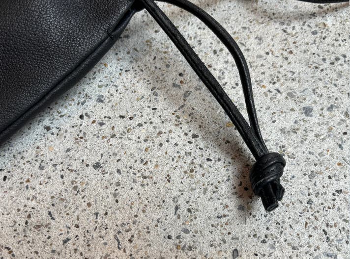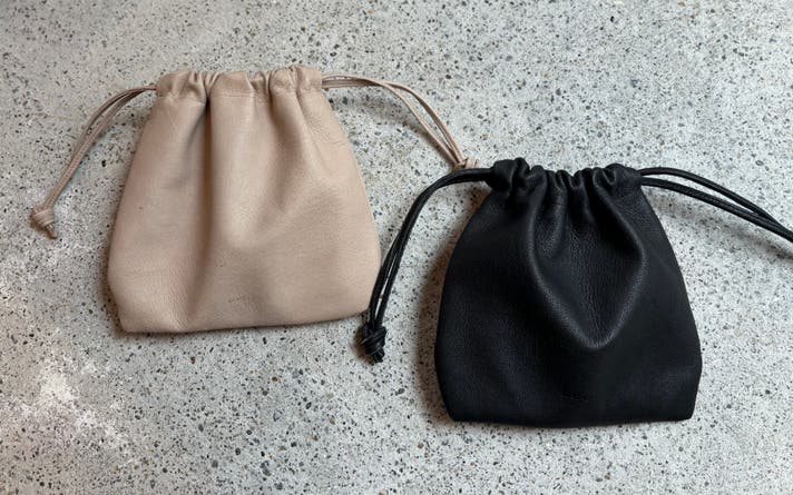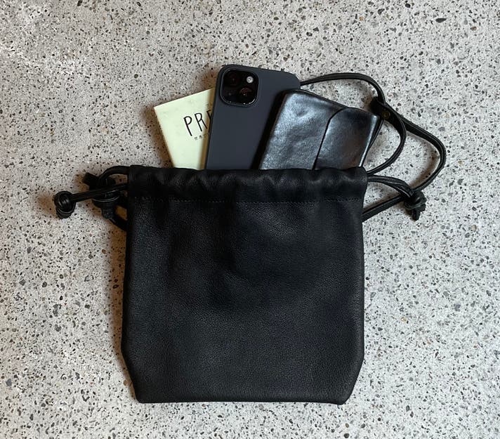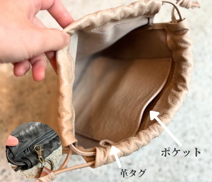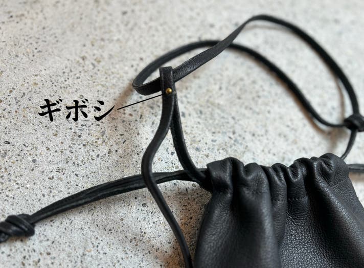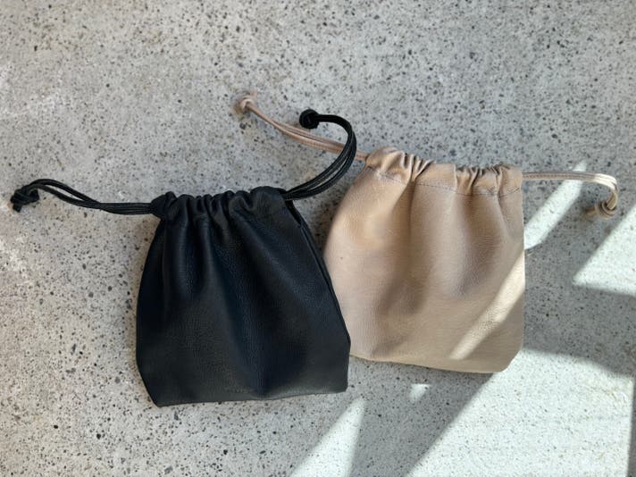 シンプルな巾着にオリジナルで制作した豚革の紐を結んでアクセントに。