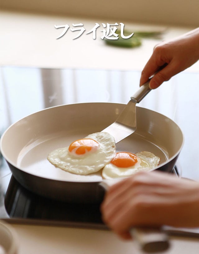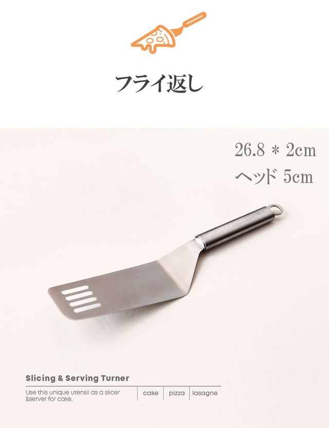 あちこちに使用できる多用途のフライ返しです。 ピザやブラウニーなどを切るカッターとして、料理をすくってひっくり返すスパチュラとして、鉄板にこびり付いた焦げを掻く用途など、様々な用途でお使いいただけます! コンパクトなので、小さなフライパンでも使用でき便利です。