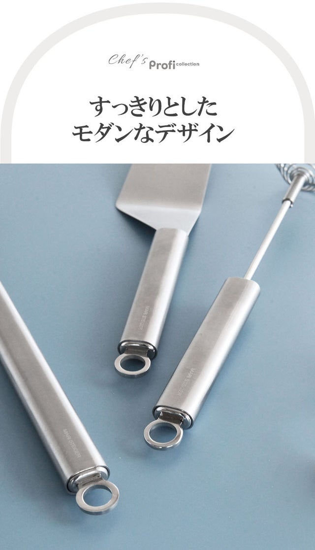 ステンレス304の素材で耐久性に優れています。 持ち手の部分までステンレス素材を使用しているのでより衛生的です。 耐食性、耐熱性が高く、腐食の心配なく安心してお使いいただけます。