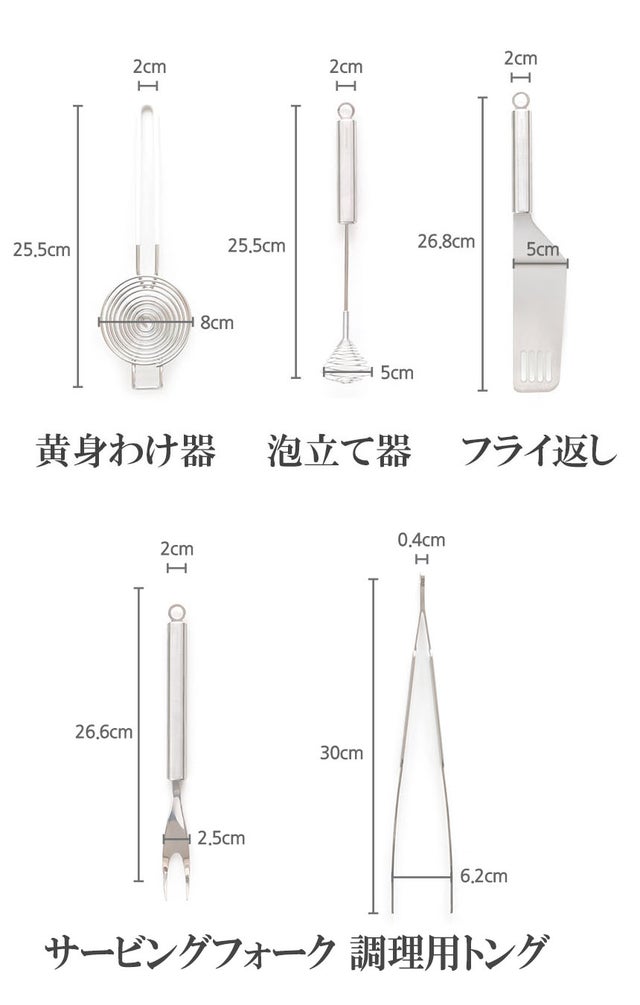 -5点セット : 黄身わけ器、泡立て器、フライ返し、サービングフォーク、調理用トング