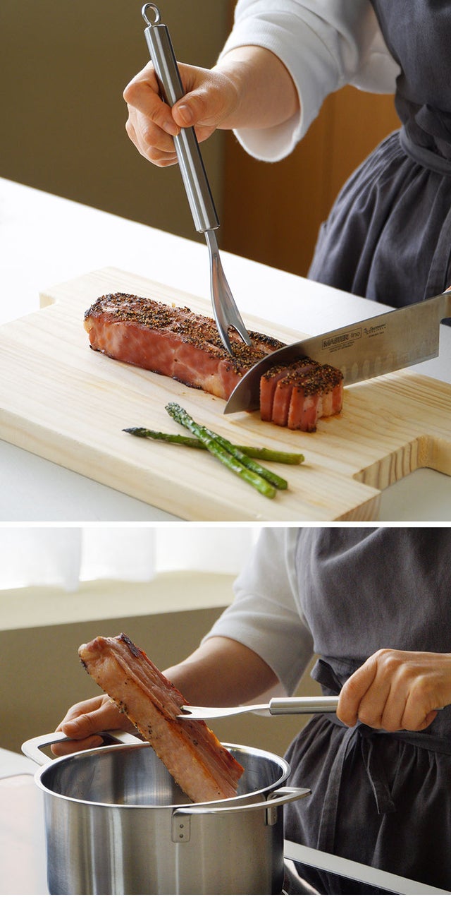 焼き上がりの熱いお肉を切り分けるときに使うとお肉が崩れにくく、手を汚す心配もありません。グリップ感の良いちょうどいいサイズ感で食卓でも使うことができ、サラダ、ジャガイモ、魚料理を食べる際のサービングフォークとして大活躍します♪