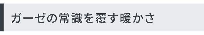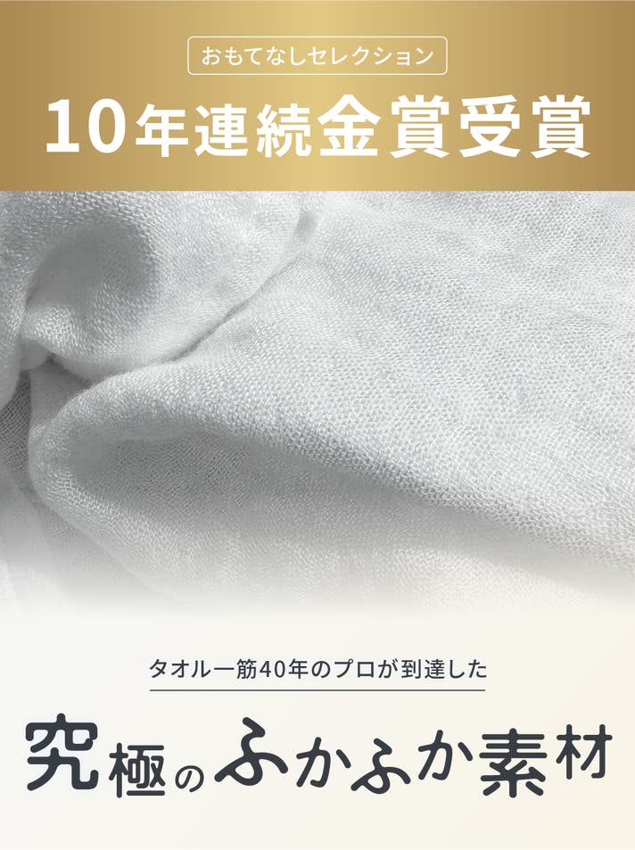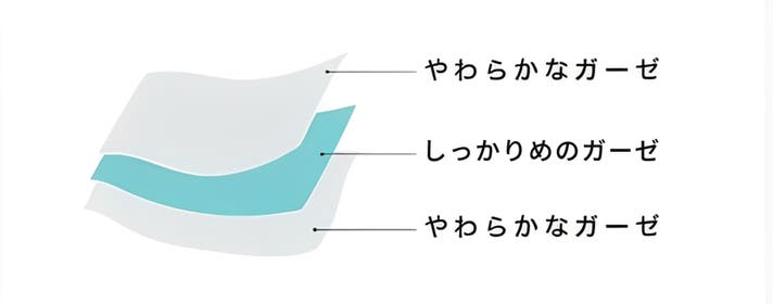 タオル専門メーカーとして40年培った技術をガーゼに応用した革新的素材。表面と裏面にふわふわの糸、中間層に強度の高い糸を配置する独自の3層構造により、柔らかさと耐久性を両立。