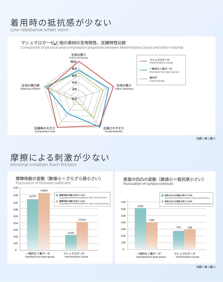 マシュマロガーゼの独自構造と糸の工夫により、肌への当たりがやわらかいだけでなく、擦られた際の刺激も少ないため、着用時の肌に対する負担が小さく、摩擦などによるダメージを軽減します。