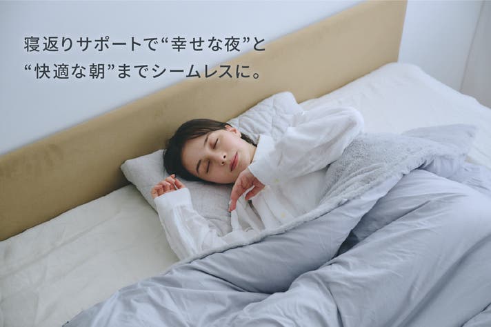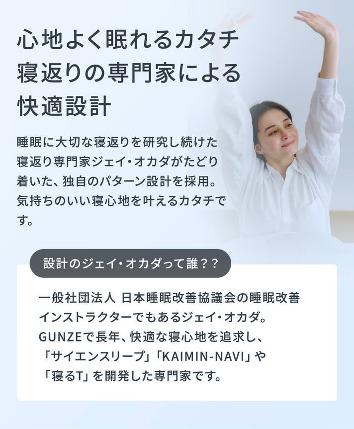 129年の繊維技術と人間工学を融合させた革新的設計。筋電図測定で寝返り時の筋肉使用量の削減を実証、モーションキャプチャ解析では腕の可動域が拡大することが科学的に証明されており、肩周りを動かしやすく、少ない筋量で寝返りすることができます。