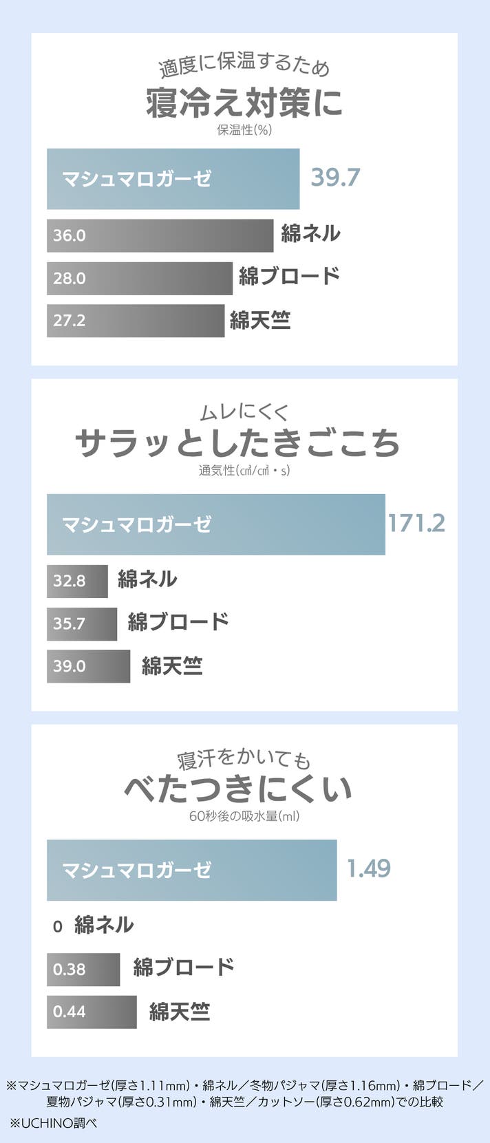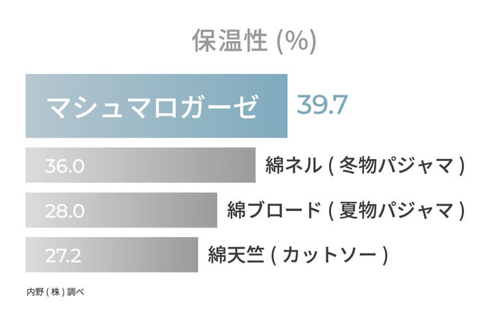 A: はい、マシュマロガーゼの独自3層構造により、通常のガーゼに比べ保温性が高くなっております。上記グラフでも示す通り冬物パジャマと比べても高い保温性がございます。