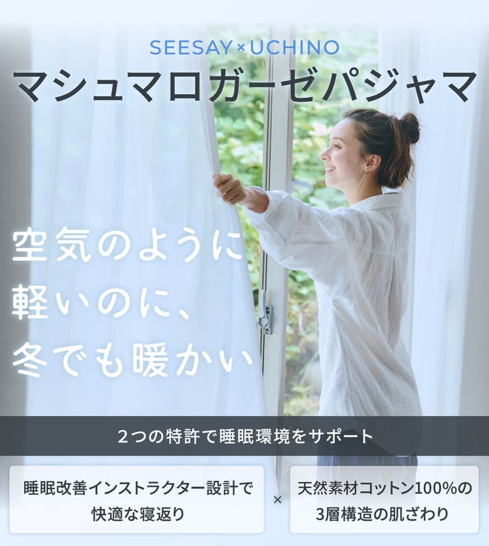 UCHINOが2013年に特許取得したマシュマロガーゼは、タオル製造40年のノウハウから生まれた革新的な素材技術です。一方、SEESAYの母体であるグンゼが持つ「快適寝返り設計」は、長年のパジャマへの研究開発で培った特許技術です。