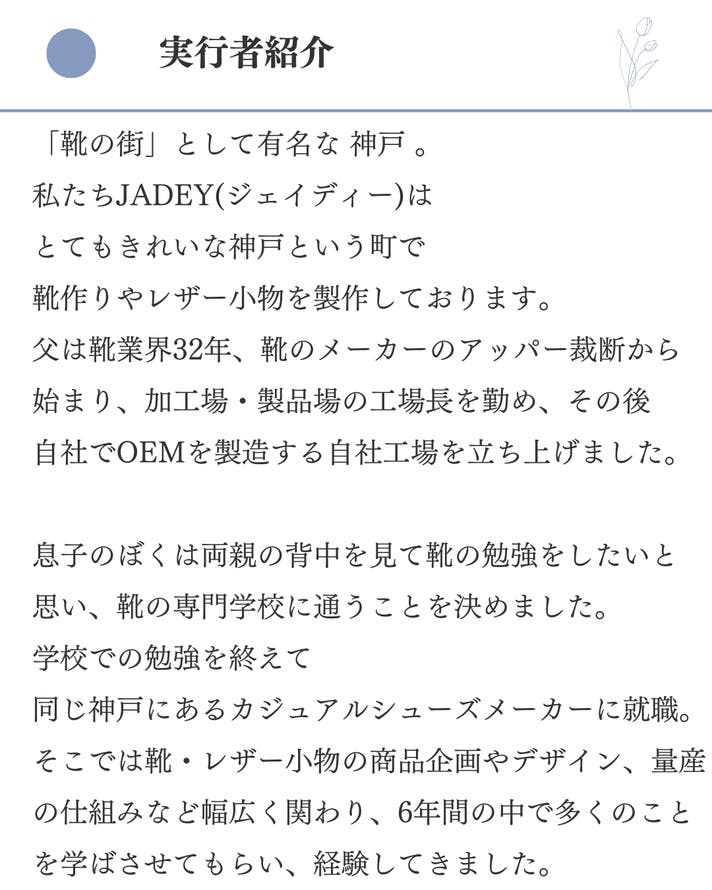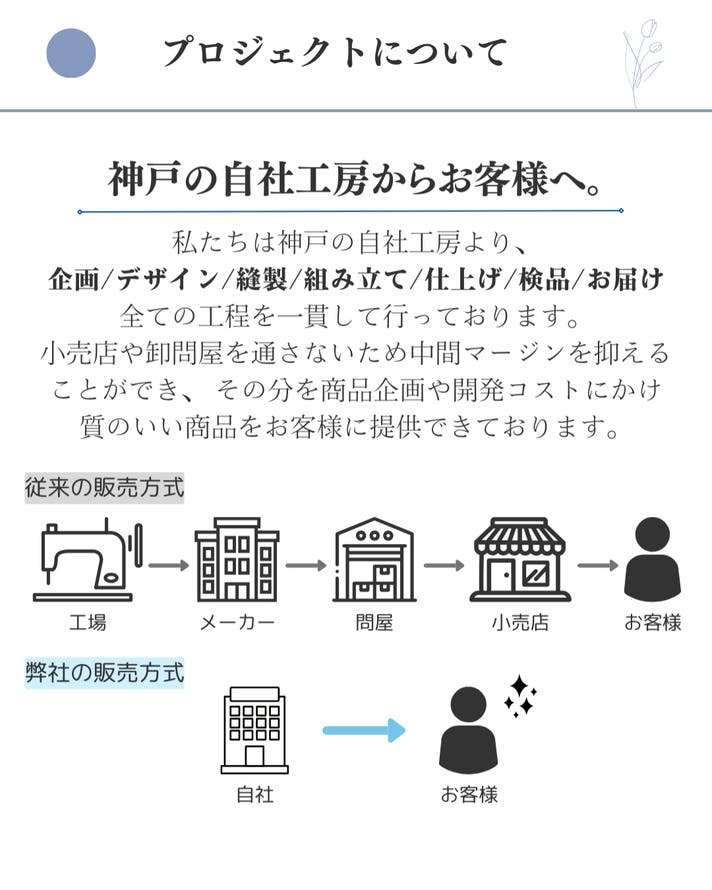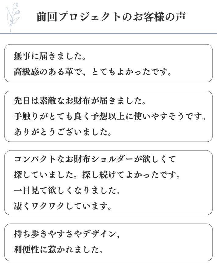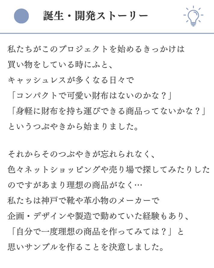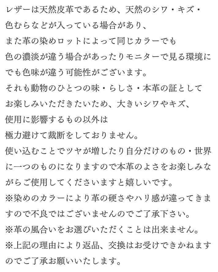 想定を上回る応援購入の申し込みがあった場合や製造工程上のトラブル・改良、配送休業に伴う止む得ない事情によりお届けが遅れる場合がございます。 イメージと違うなどのお客様都合での返品・返金はできませんのでご了承ください。 プロジェクトページに記載している内容に変更がある場合は、活動レポートなどでご連絡させていただく予定です。 皆さんの生活が少しでも楽しく豊かになるよう、職人一同、心を込めて作ってまいりますので 応援のほどよろしくお願いいたします。 ・国産姫路レザーを使用しており、表面が綺麗なスムース素材(シボが少ない表面)を使用しているため、製造上表面にキズ・色ムラ・シミ・シワがある場合がございます。 ・スムース素材は表面がデリケートなため、ミシンなどの製造過程で僅かな当り傷・押し跡等が見受けられる可能性がありますが不良ではありません。 ・深い傷も、エイジングとともに馴染み、革の風合いへと変化していきます。 ・濡れた場合は放置するとシミになりますので乾いた柔らかい布で軽く押すようにして水分を取って下さい。 ・日常の使用で革が馴染むためサイズが多少変化します。 ・色落ちが生じることがございますので薄いカラーの衣料との組み合わせはご注意ください。 ・ロットにより、色・質感・柔らかさ多少異なります。 ※モニター環境により、実際の商品の色合いと多少異なってみえる場合があります。 ・既存の材料がなくなってしまい使うことができなくなった場合、材料・パーツ・仕様を変更させていただく場合があります。 ・金具は色の変化がしやすく、真鍮金具は黒ずみやすい特性があります。 ・万が一、当初想定の材料仕入れに影響が出てしまった場合は、同等の品質の素材に変更になる可能性があります。 本文中に記載させていただいたスケジュールは、あくまでプロジェクト公開時点の予定です。 原則として、配送遅延に伴う応援購入のキャンセルはできませんが、 リターン配送予定月から 3ヶ月 を超えた場合には、希望者に限りキャンセルにて対応させていただきます。
