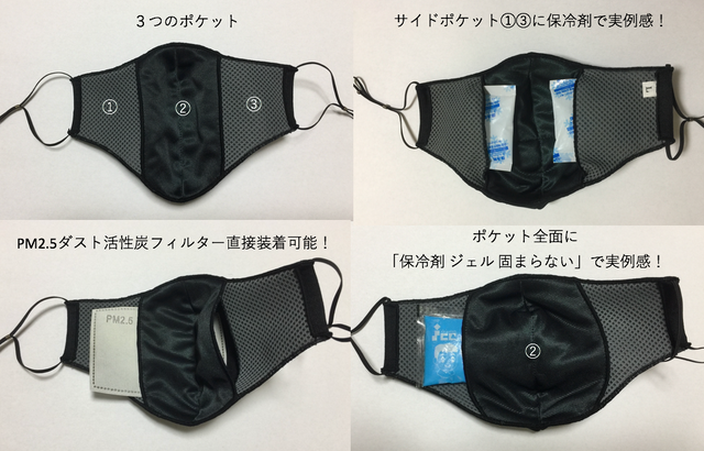 - メッシュポケット構造で快適実冷感(2タイプの保冷剤対応)さらに、pm2.5フィルターも挿入可能