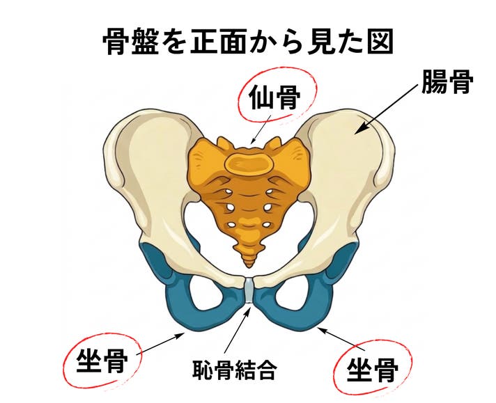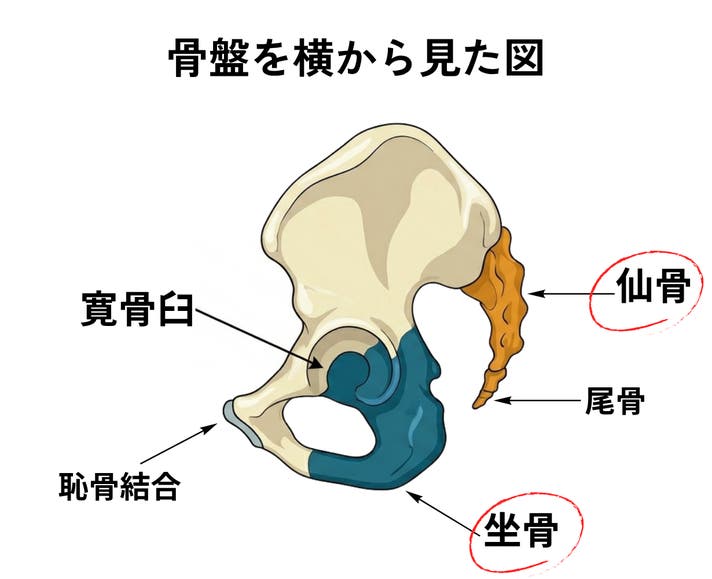 坐骨(図の青い色の部分)とは、お尻のふくらみのすぐ下にある骨のこと。