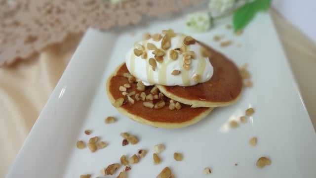 卵やベーコンんと一緒にパンケーキサンドやナッツやフルーツと一緒にお召し上がりください