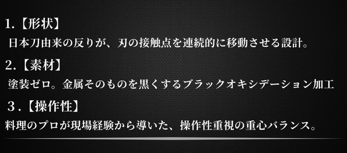 - 食材の切れ方を研究し、日本刀の反りを取り入れ、少ない力で切れる“細胞を活かす切れ味”を追求。