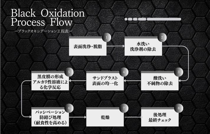 特殊な酸化反応により金属そのものを黒く仕上げる「ブラックオキシデーション加工」を施し、塗装やコーティングを使用せず、耐久性もあり、自然なままの仕上げになっております。