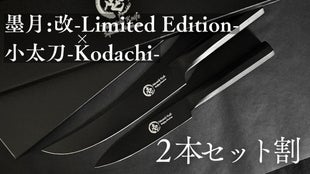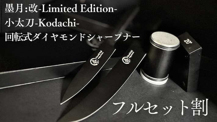 主役の一本【墨月:改】と、小回りの利く【小太刀-Kodachi-】、切れ味を支える【回転式シャープナー】を揃えたフルセットです。