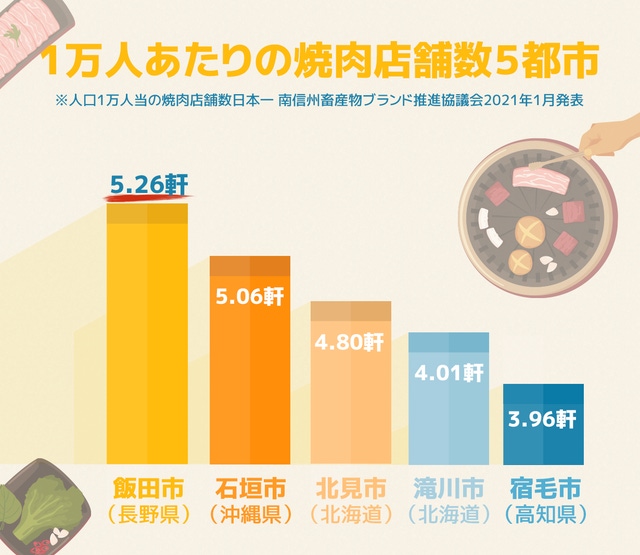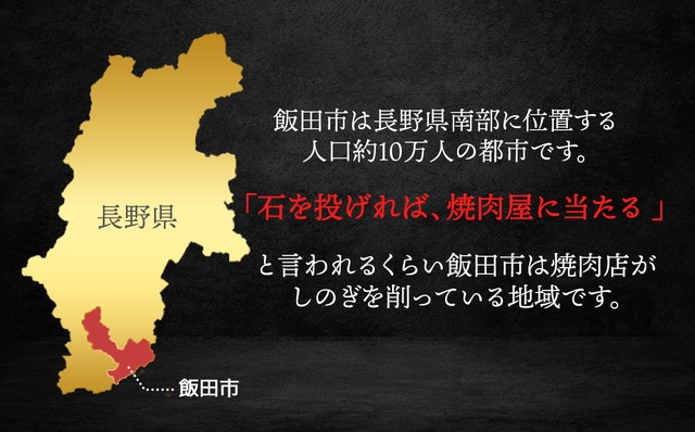 飯田市は人口1万人当の焼肉店舗数日本一であり、独特の焼肉文化を持った街です。