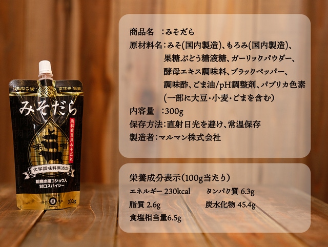 ・焼肉の付けダレをメインとして、肉野菜炒めや肉みそなど肉関連の幅広い料理にも合う信州みそともろみをベースとした甘口だれ。アクセントとして、粗びき黒コショウをブレンドしました。