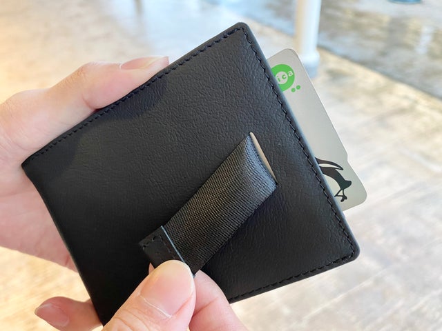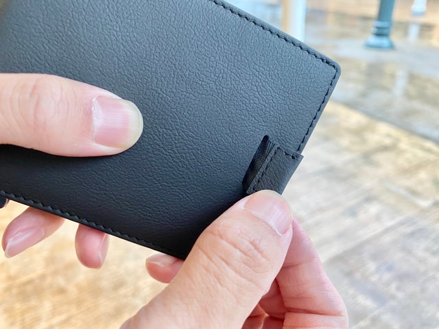 外側に付いているベルトを引っ張ると、入れているカードを簡単に取り出すことができます。