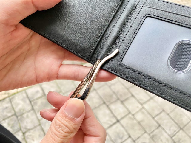 お札を持ち歩く方、持ち歩かない方、どちらにも対応できる、取り外し可能な札挟みクリップ式の財布です。お札は1〜7枚ほど挟むことができます。