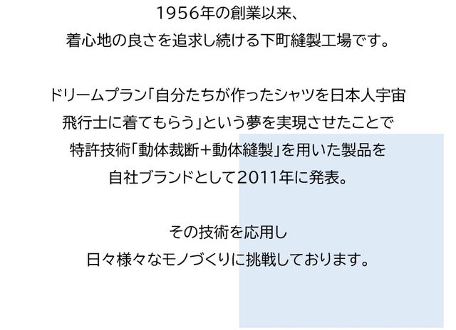 宇宙船内被服に採用実績のあるこの「動体裁断」技術を融合することで、衣服解剖学から導き出された美しいシルエットと驚きの着心地を実現し“着る人の笑顔”を目指していきます。